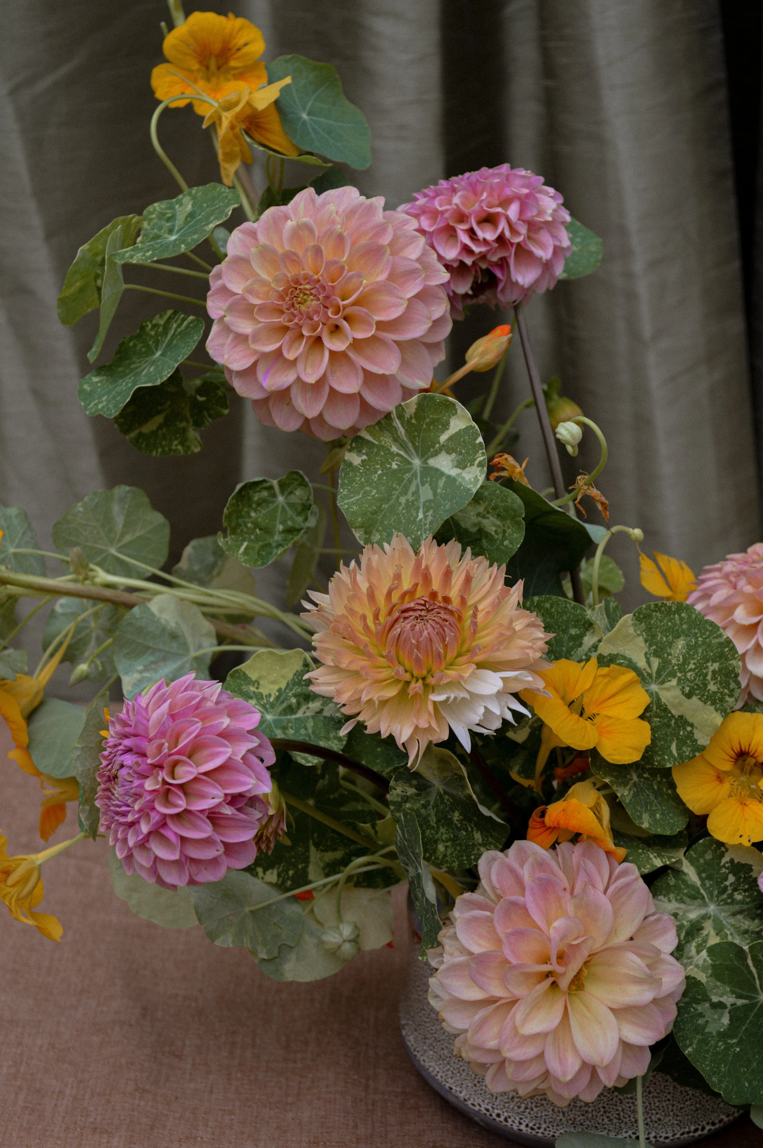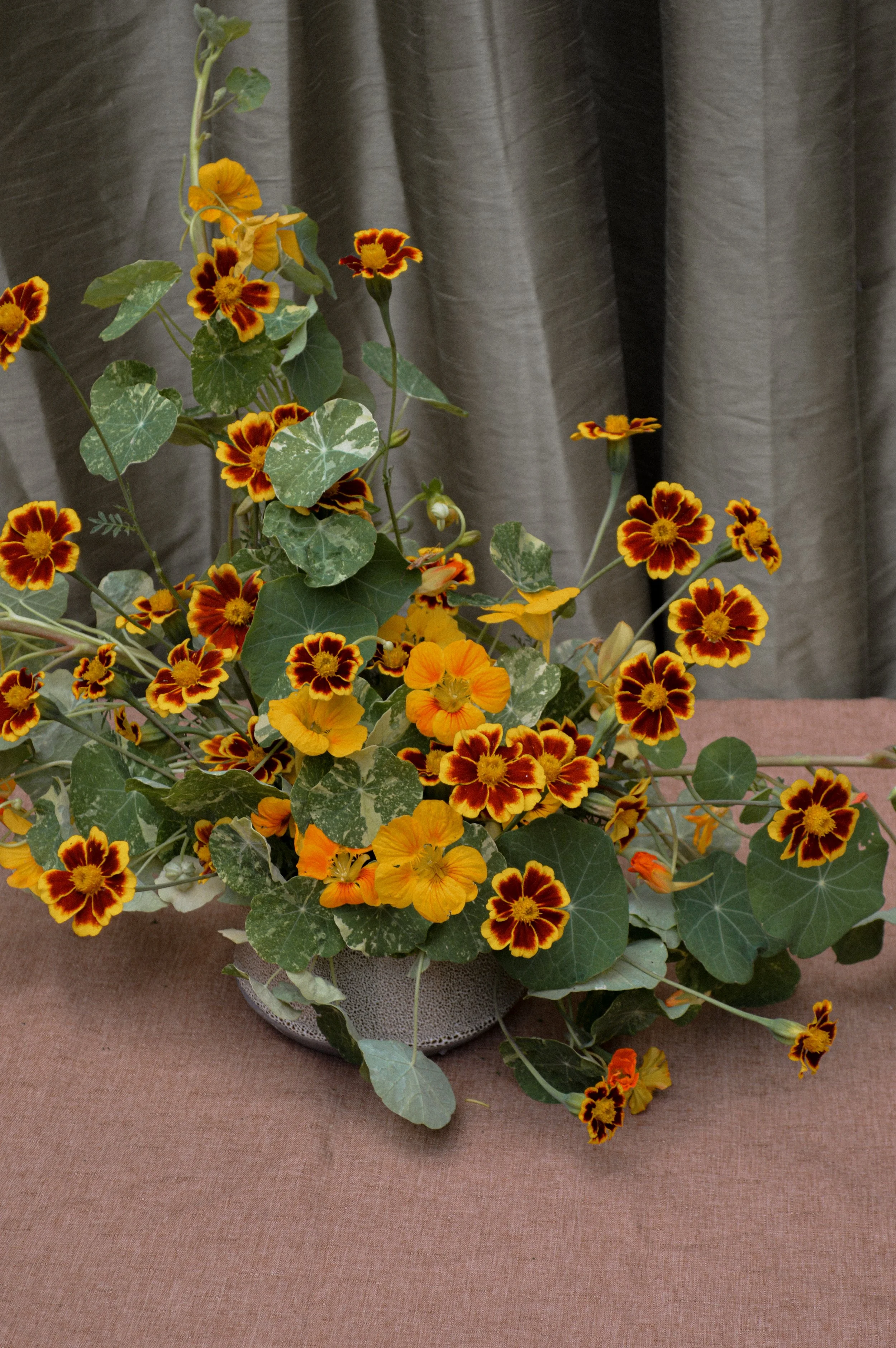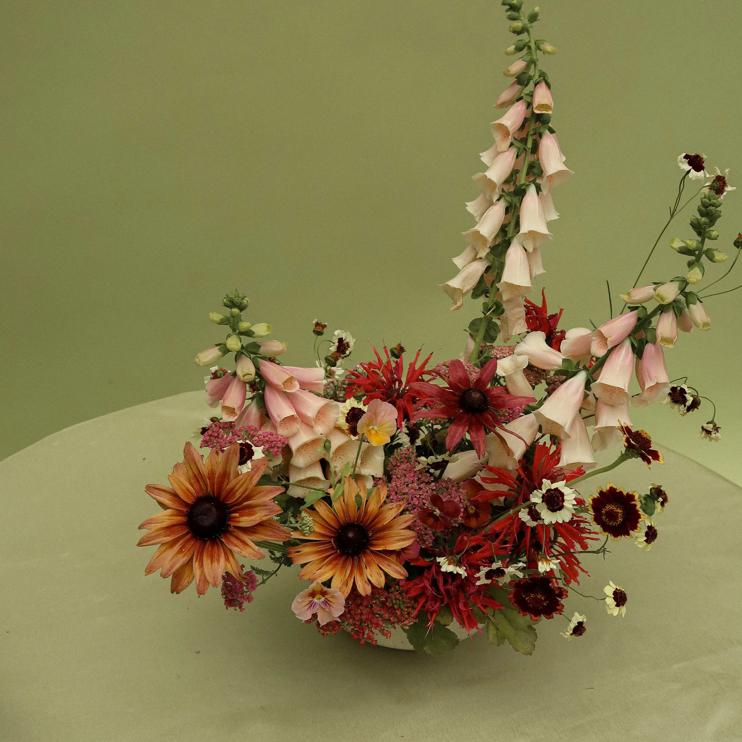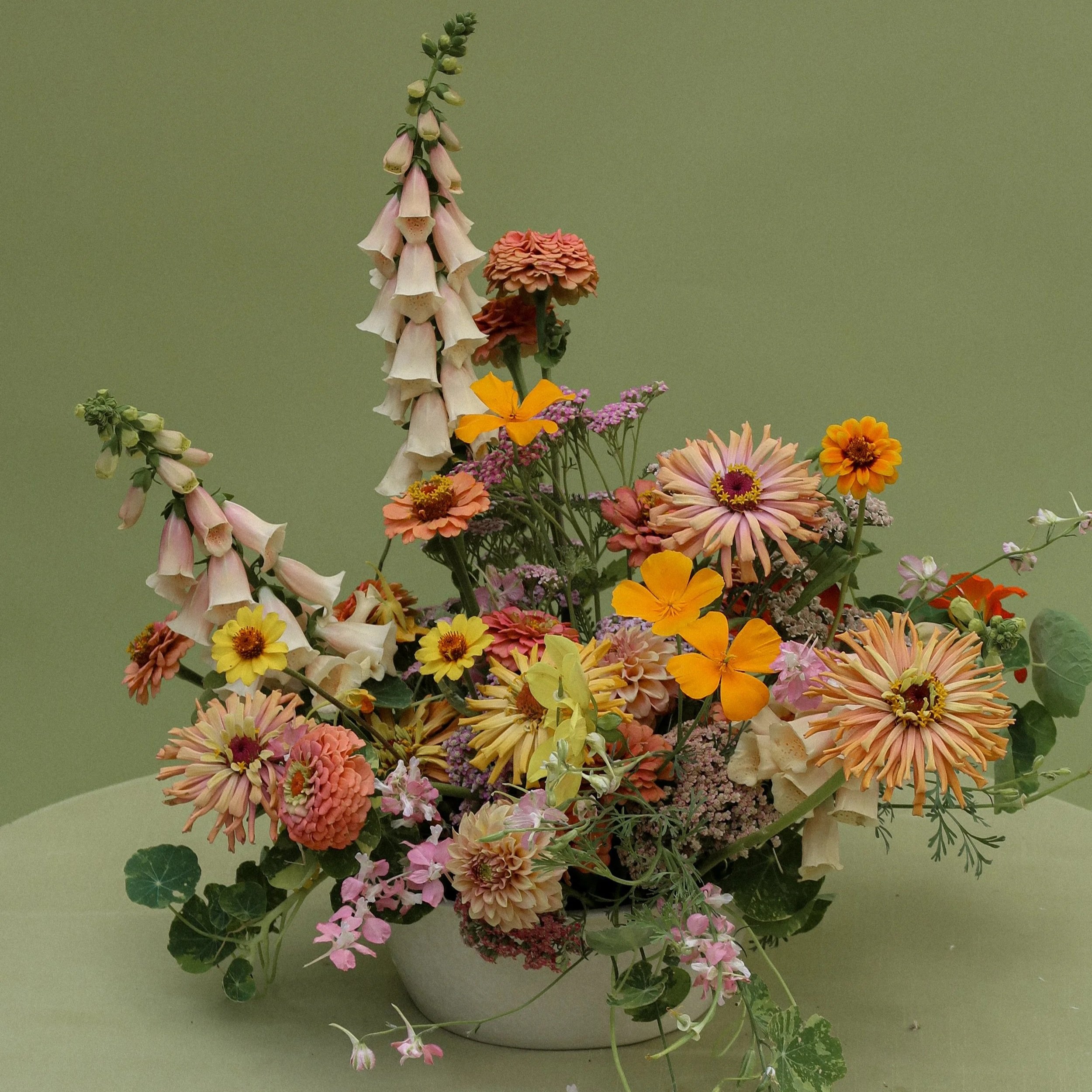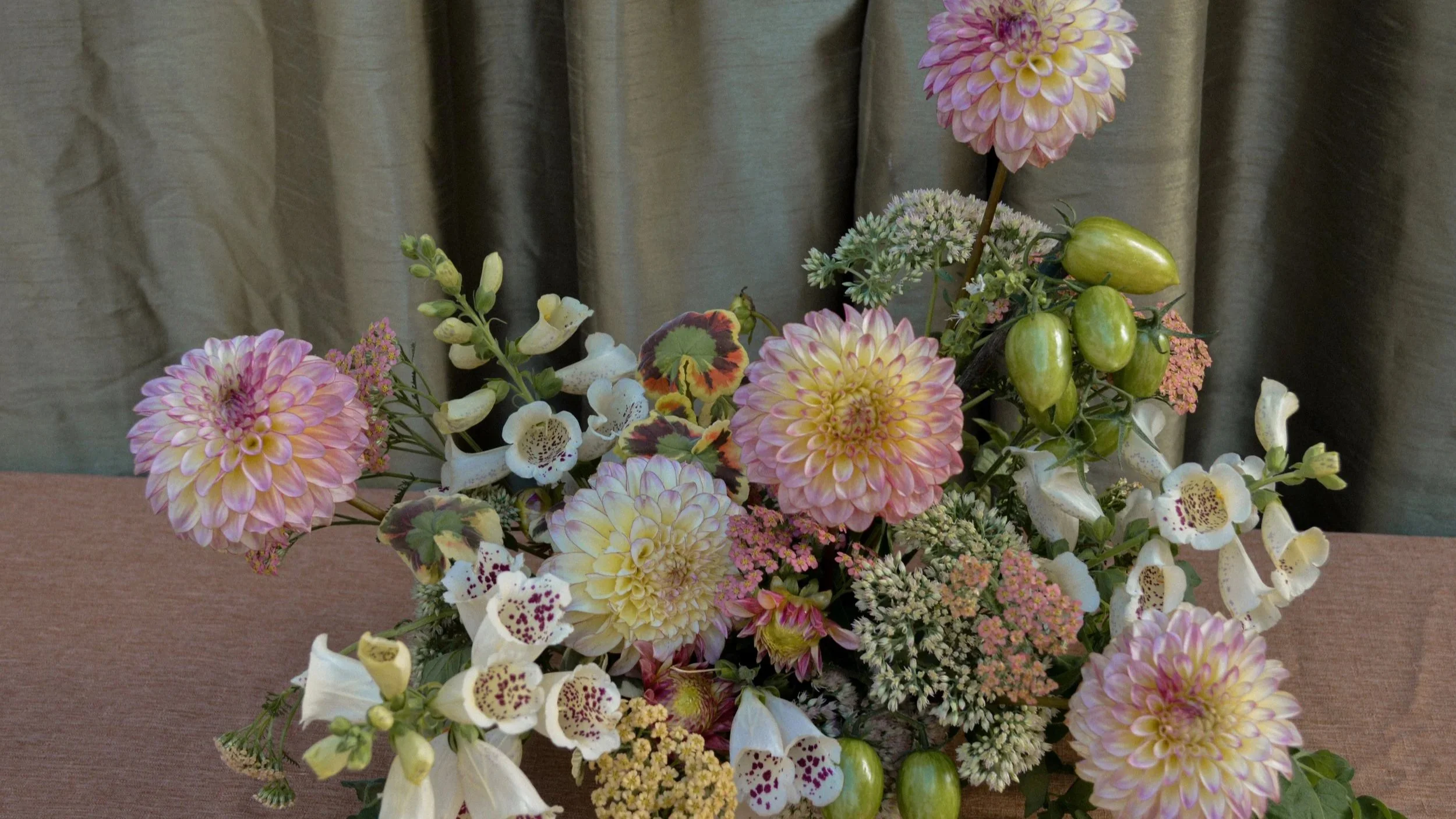 When I design, I think in layers and textures, like piecing together a puzzle made of color, scent, and movement. I love mixing traditional blooms with unorthodox elements — fruits, vegetables, branches, herbs — anything that tells a story about the season and the place it came from. My process is meditative: slowing down enough to listen to what each stem wants to do and finding balance between the natural shape of things and the story we’re trying to tell.